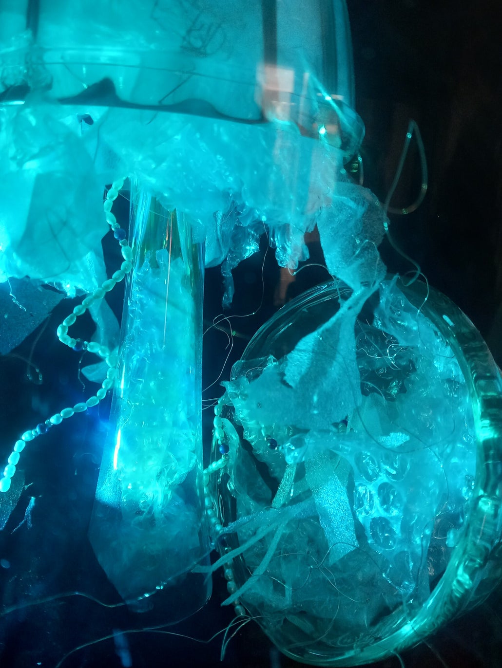 Meet Melly the Jellyfish 🪼 (standing): jelly mould, champagne flute, bubble wrap and wire with a seed pearl and lapis lazuli strand.