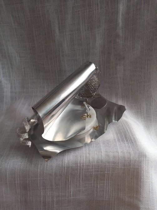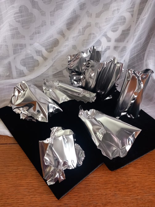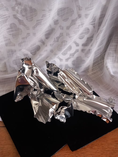 An 8 piece aluminium sheeting interaction sculpture that can be rearranged to suit and soothe. Standing on a double slate and black velvet base.