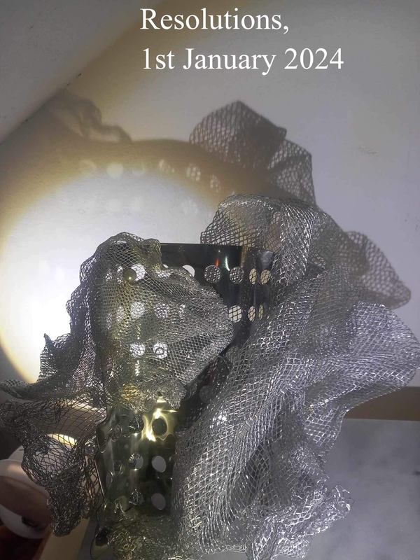 New piece for an Arts Centre in Worcestershire: bringing eight elements together: aluminium (panels, mesh, wire); titanium mesh; stainless steel (circles); sterling silver (patinated squares, tiny hoops and solid pellets of 100% recycled silver); marble; velvet; sparkle setting spray; and of course a single pearl (freshwater grey baroque).
